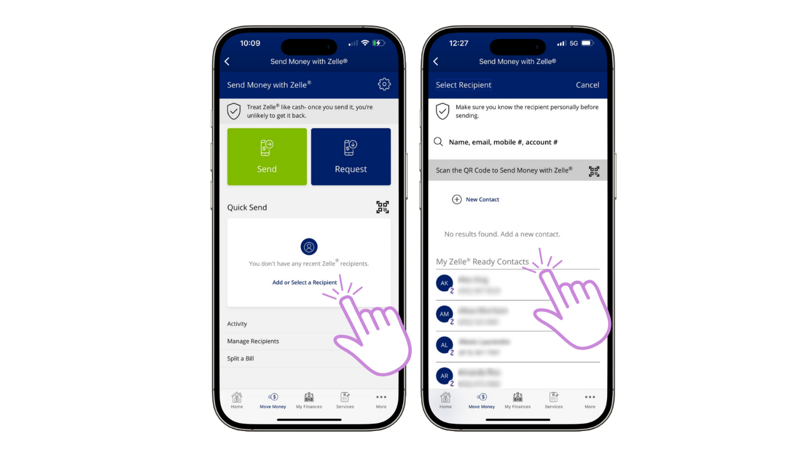 When you're ready to send or request money with Zelle® simply select "Send" or "Request" and select your Zelle® Ready Contact.
